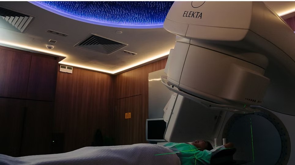 Patients lie comfortably on the treatment couch while multiple radiation beams are delivered from different angles, converging precisely on the tumour. Throughout treatment, the care team continuously monitors positioning to maintain sub-millimetre accuracy.
